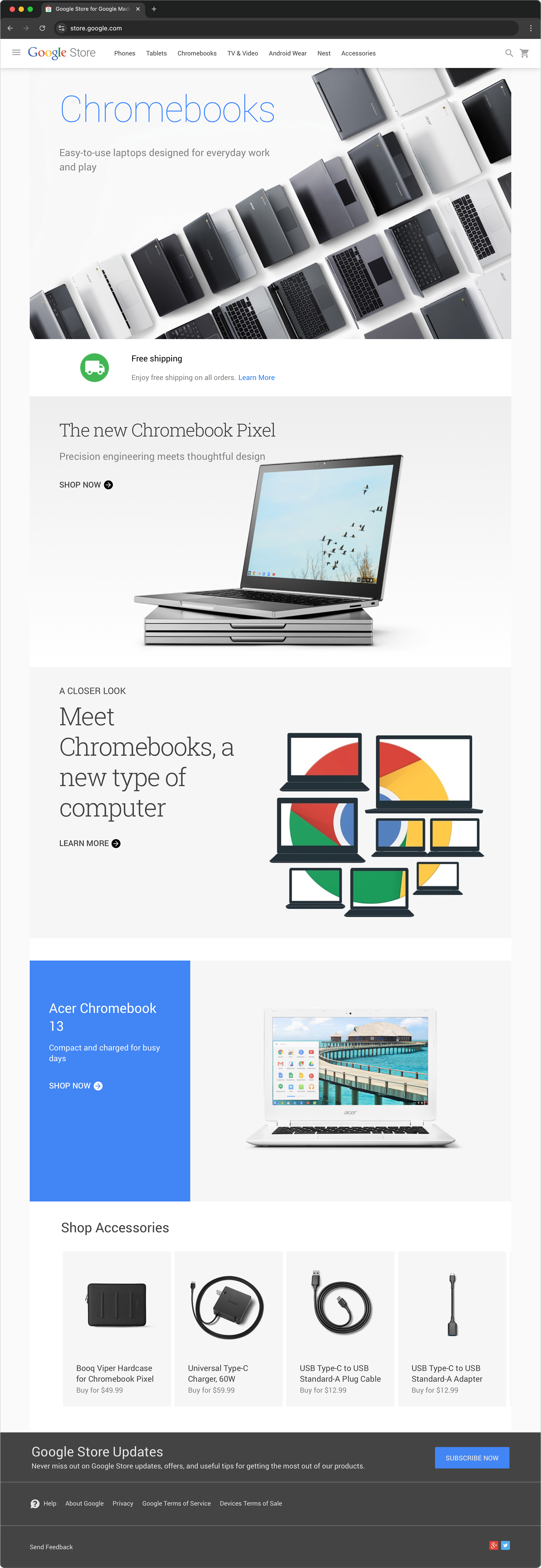 The new home for the latest devices made with Google. Shifting away from Google Play to launch a dedicated storefront for their Pixels, Chromebooks, and Nest products. Working within Google's SF Brand Studio our team created templates, work flow systems, design specifications and best practices for both designers and developers alike to implement for the launch of Google Store.