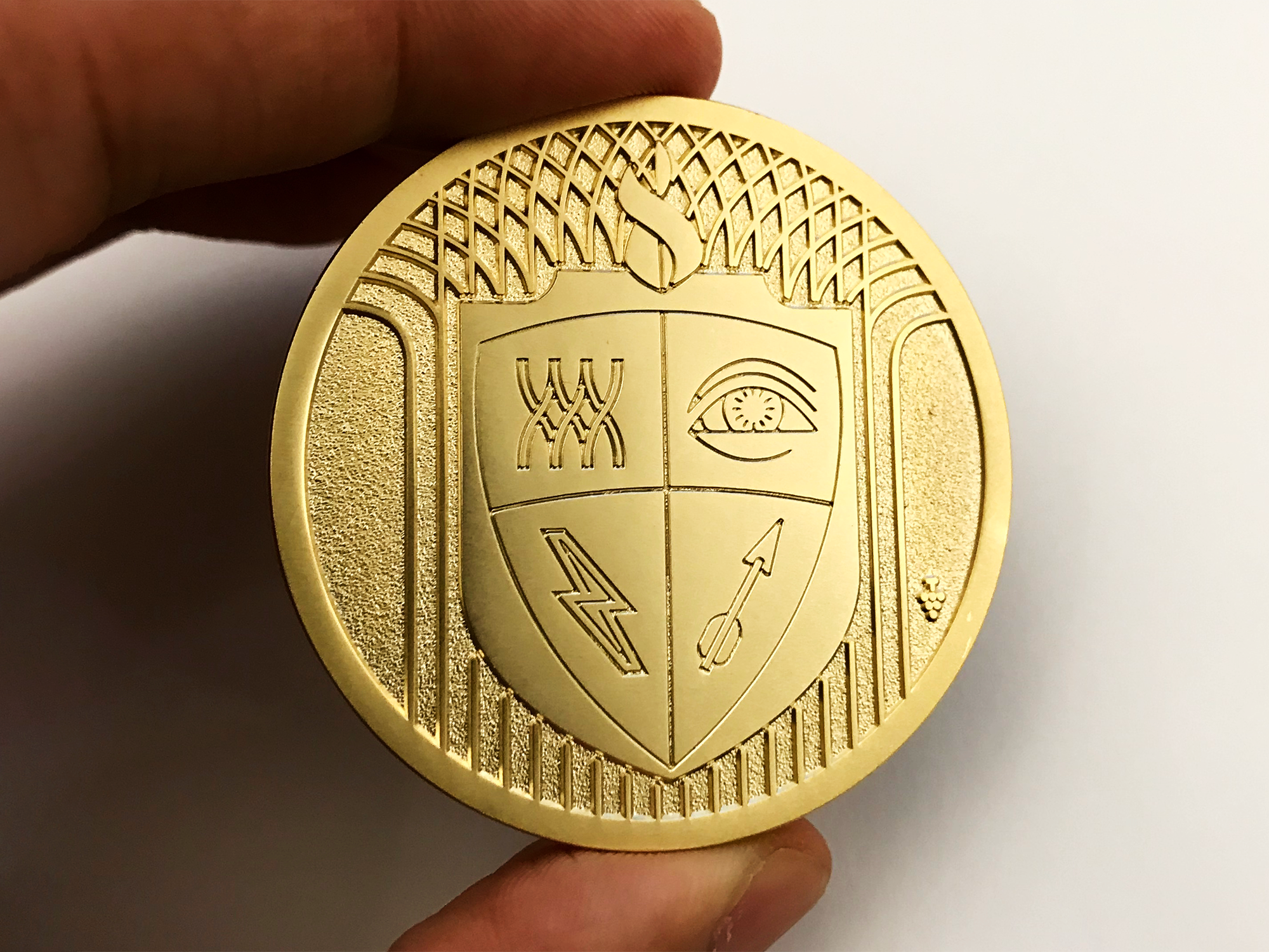 Back of coin. The four symbols speak to the team’s values and the little grapes icon to the side is a nod to the Purple Team.