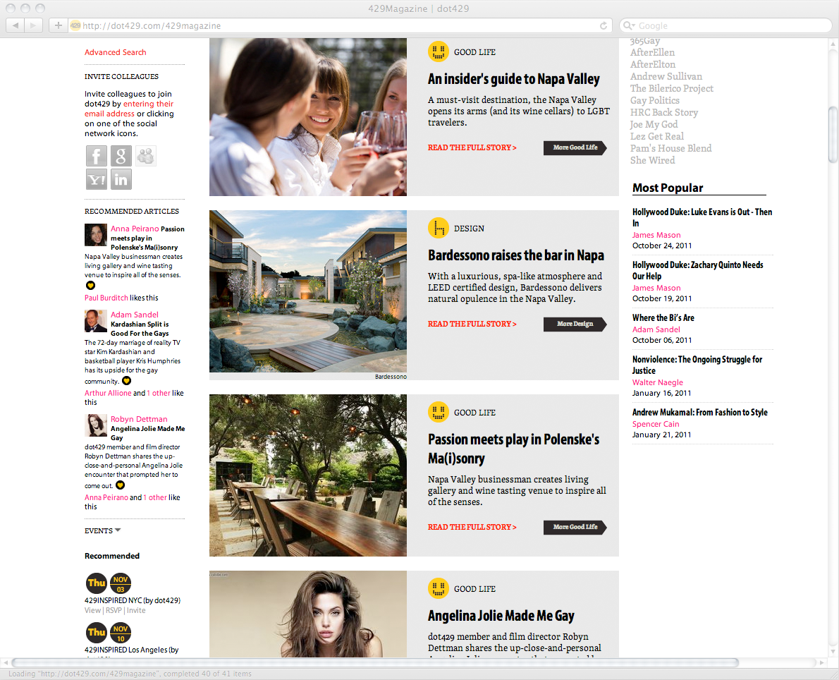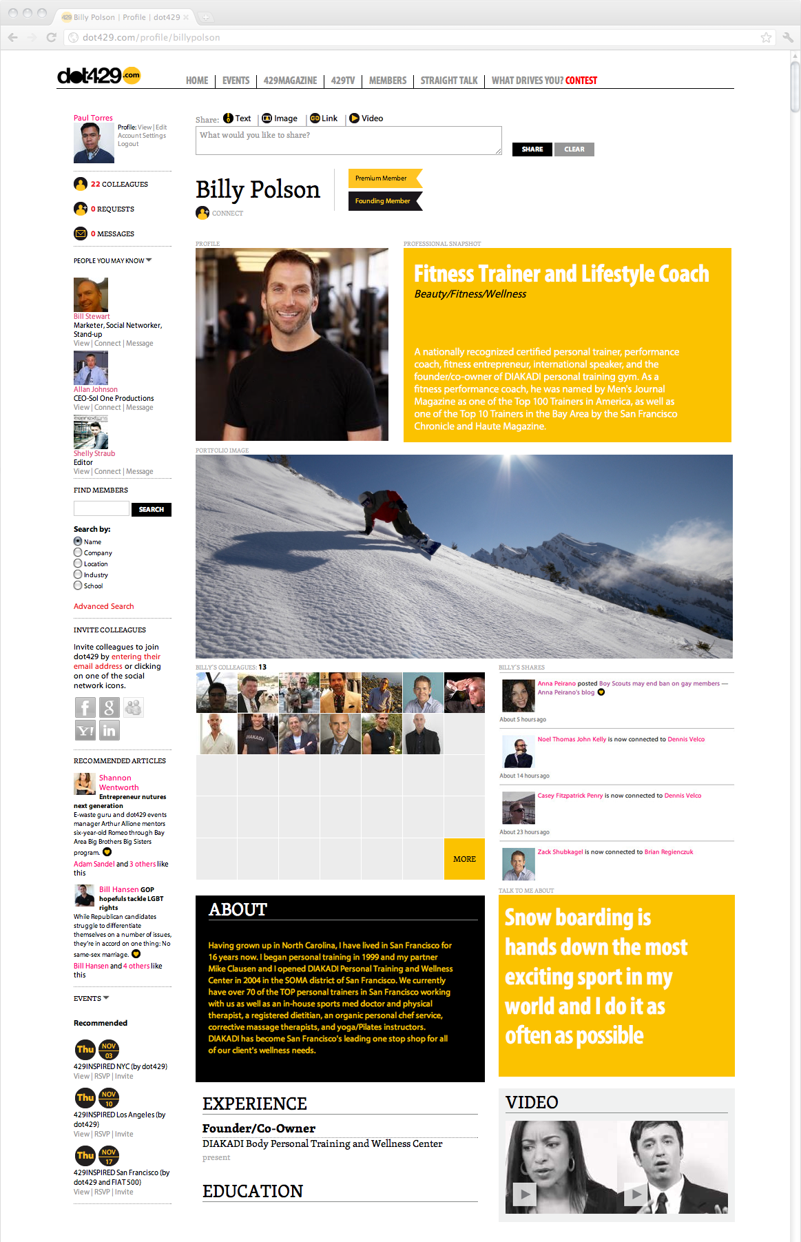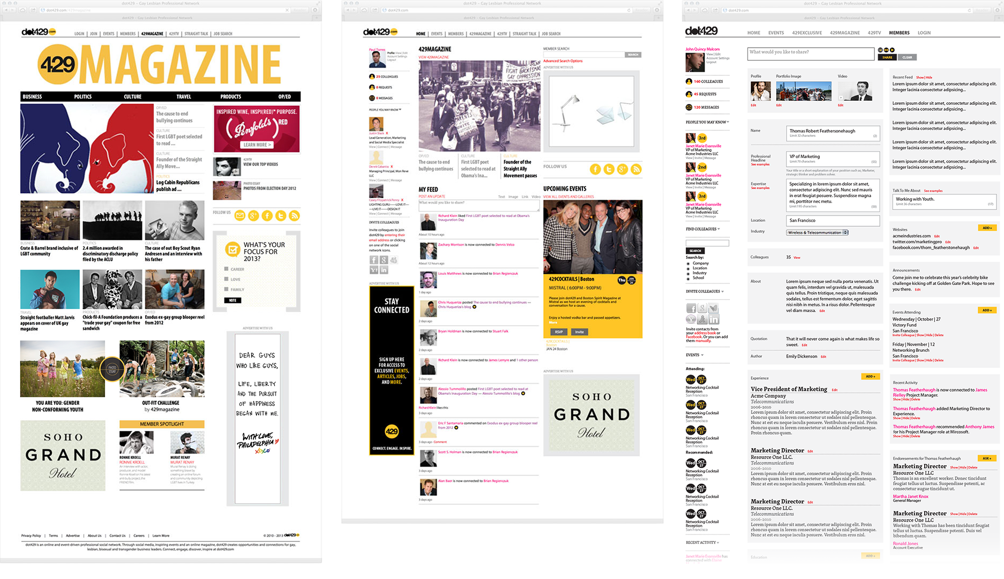 Designing more than a social network. At it's core, dot429 functioned as a social networking platform, live events hub, and digital editorial magazine. My role as the lead designer was to harmonize these three distinct services into a seamless brand experience that felt both experiential and vibrant. The result was a portal that didn't just serve as a platform but became a hub of empowerment, education, and connection for LGBTQ+ professionals.