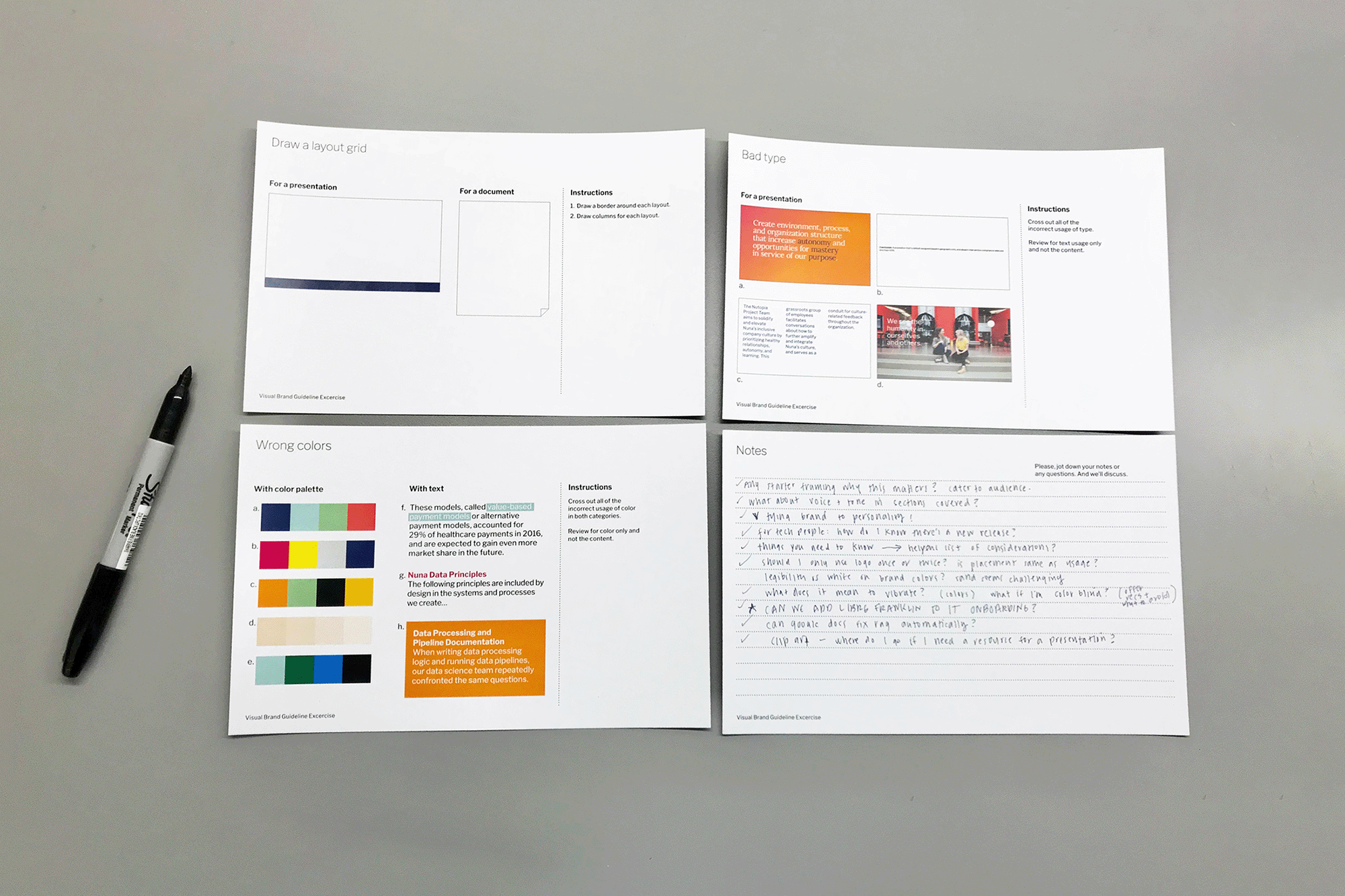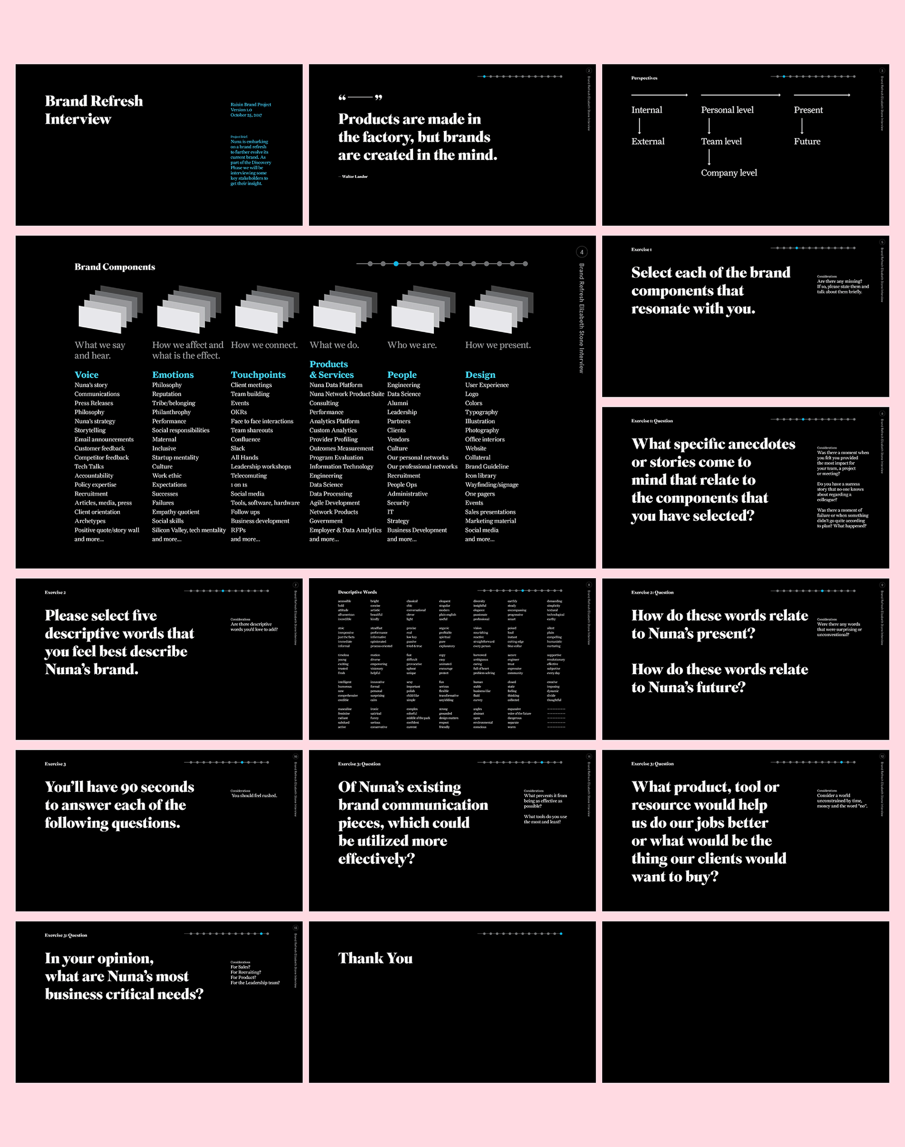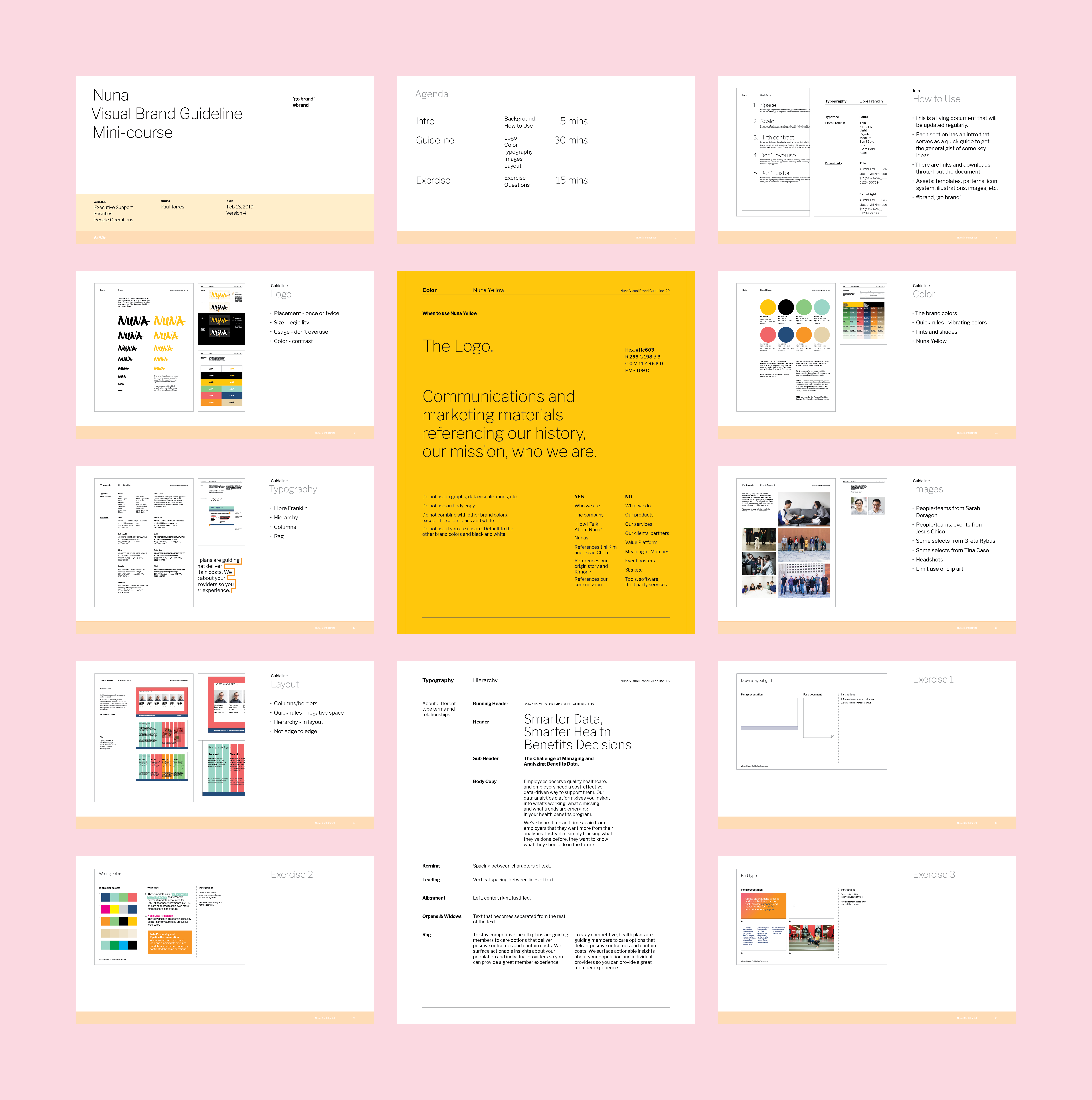 When I stepped into my role as the sole brand leader at Nuna my goals were to elevate the brand and strengthen how teams worked together. 1) On projects I invited other teams into the process early to collaborate. 2) During the brand refresh, I developed the workshop interviews and hands-on brand discovery exercises. 3) I created a brand guide mini-course to help teams connect with the brand and use it with confidence. 4) As the work took shape, I looked for ways to bring warmth and delight into the brand. 5) I focused on building chemistry on our Design team by introducing small rituals and being a general advocate for the Design team to Nuna as a whole.