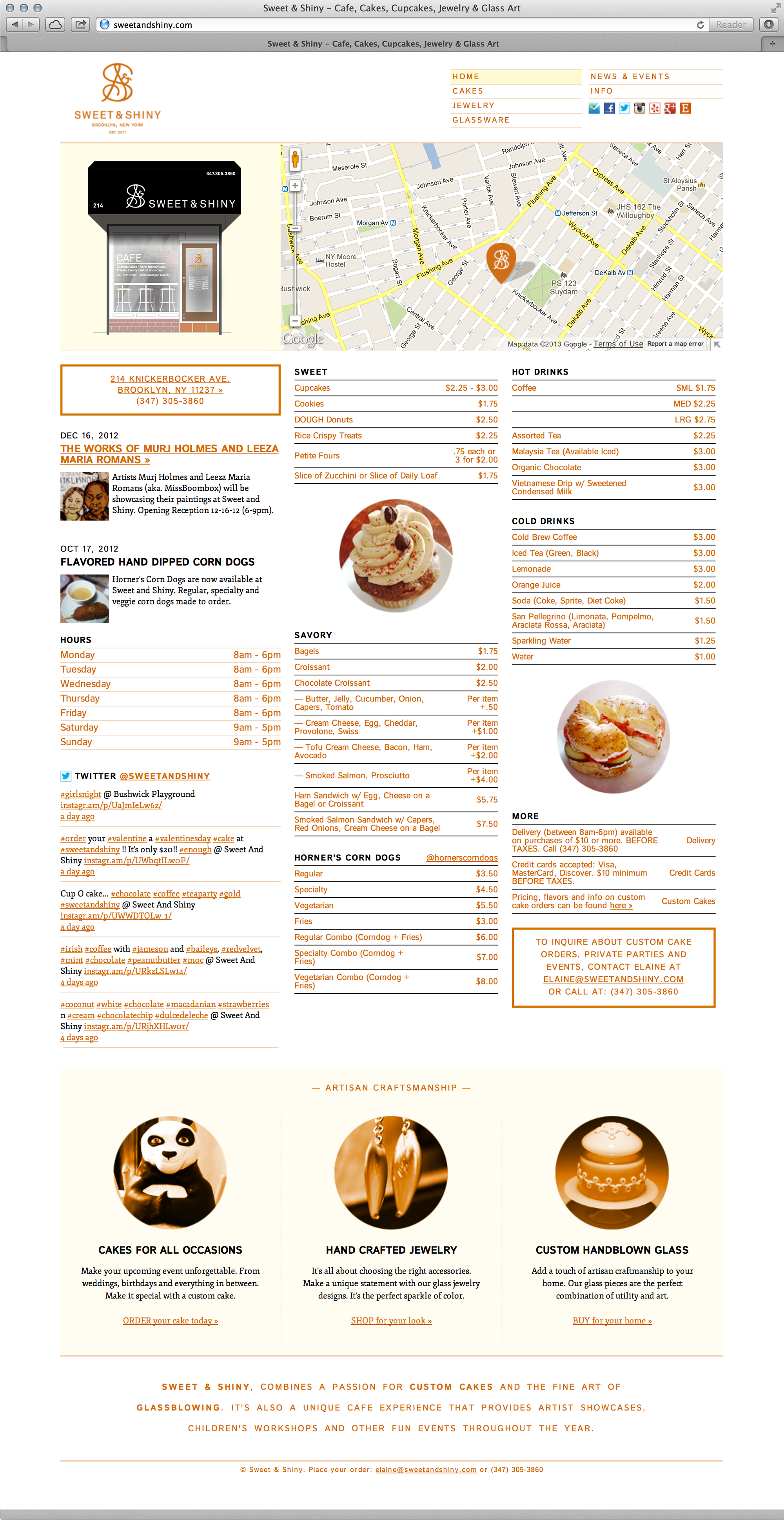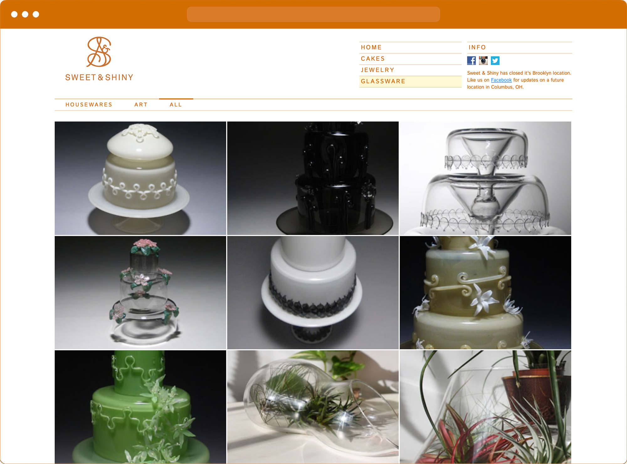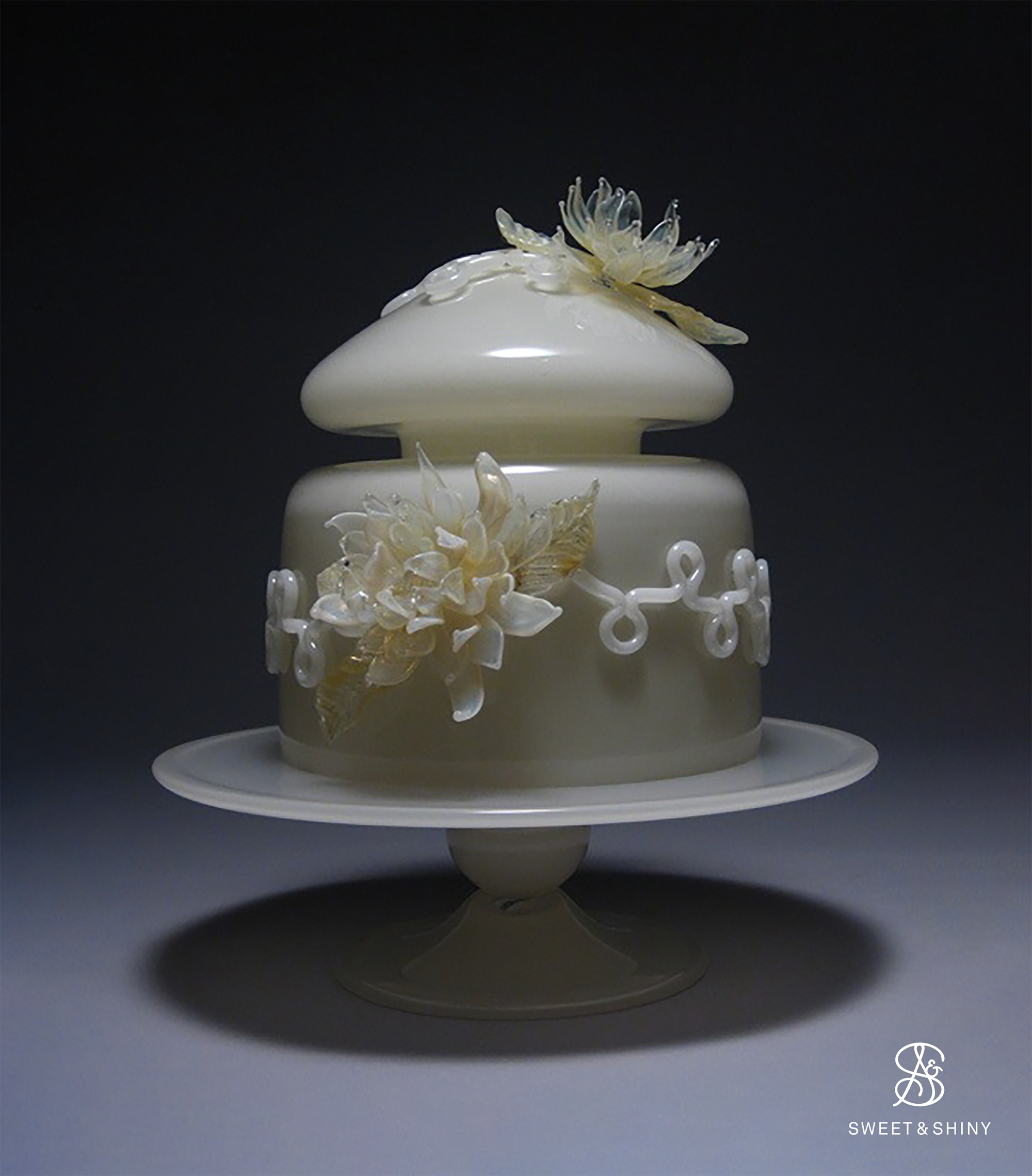 Sweet and Shiny was created by owner Elaine Li-Reyes who is a glassblower and professional cake designer. She has over 15 years in each field and has been featured in productions for Disney+ and The Food Network. Sweet and Shiny had a brick and mortar location in Bushwick Brooklyn and currently operates in Columbus, Ohio.