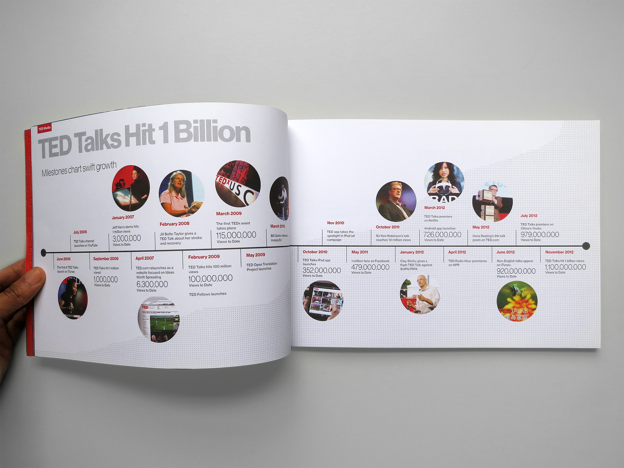 Milestones spread. Chronicling the big milestones TED has reached over the years.